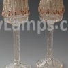 Cut glass faceted crystal column supported by 4 footed ormulu base with a 2 arm candlabra with clear Cricklite domes and dark green silk repro shades with clear glass beaded fringing