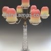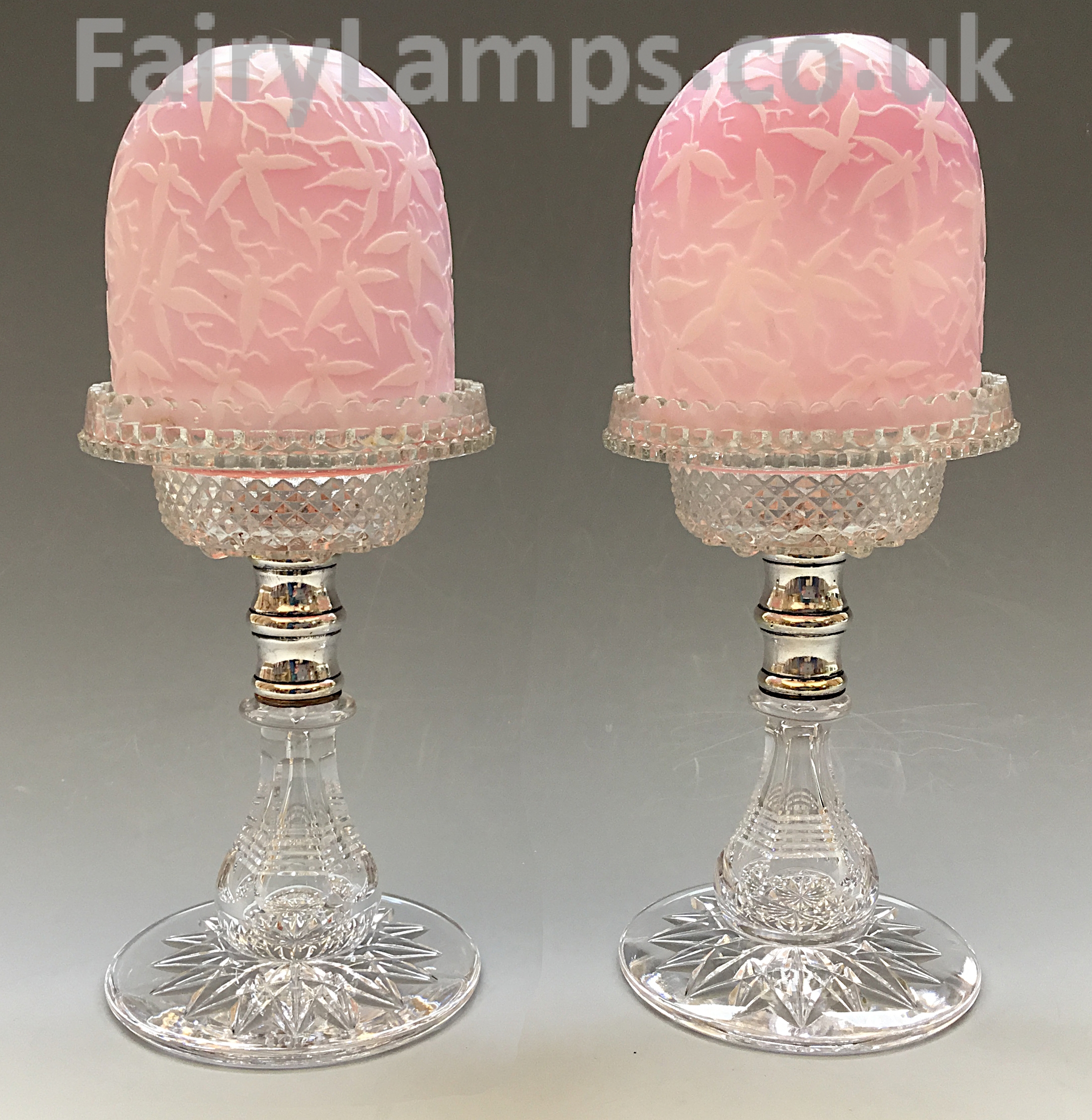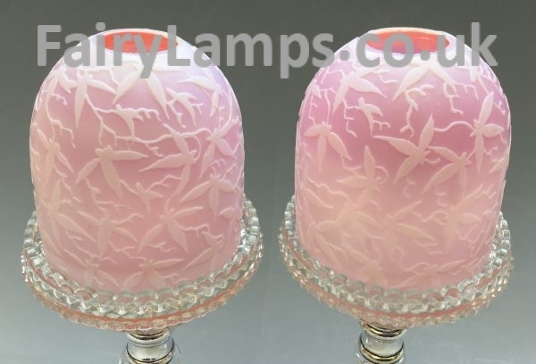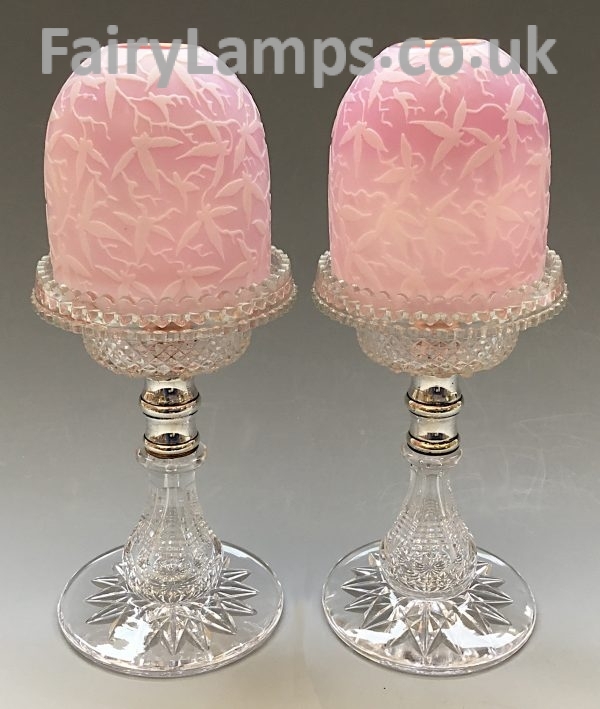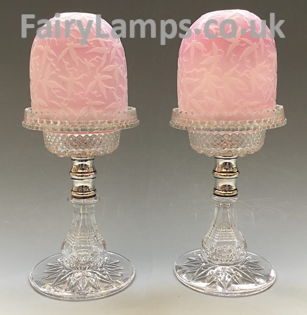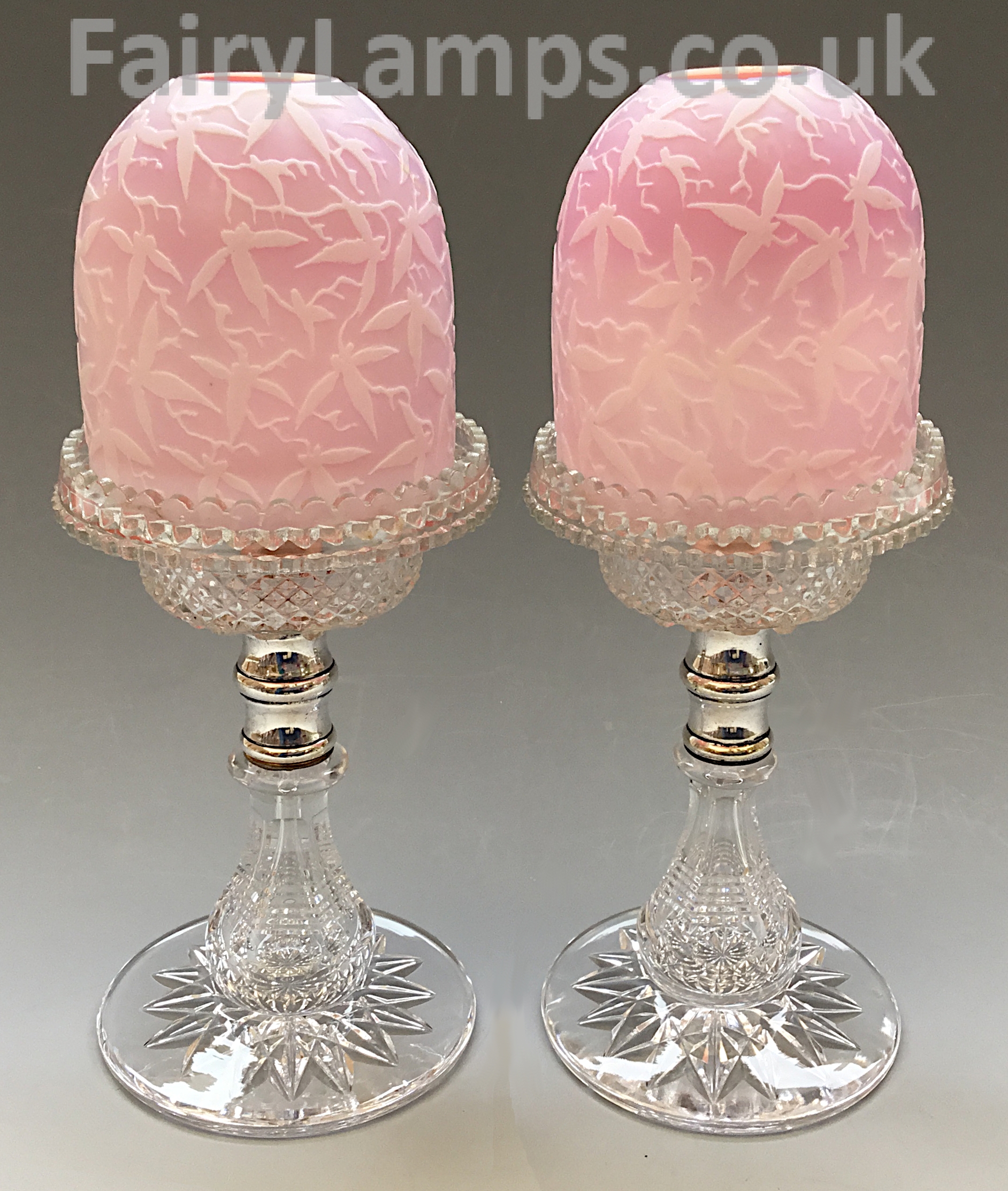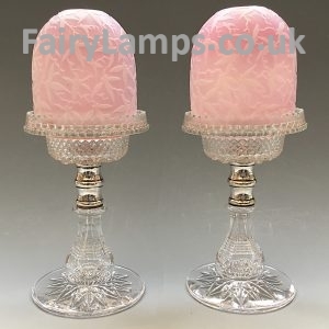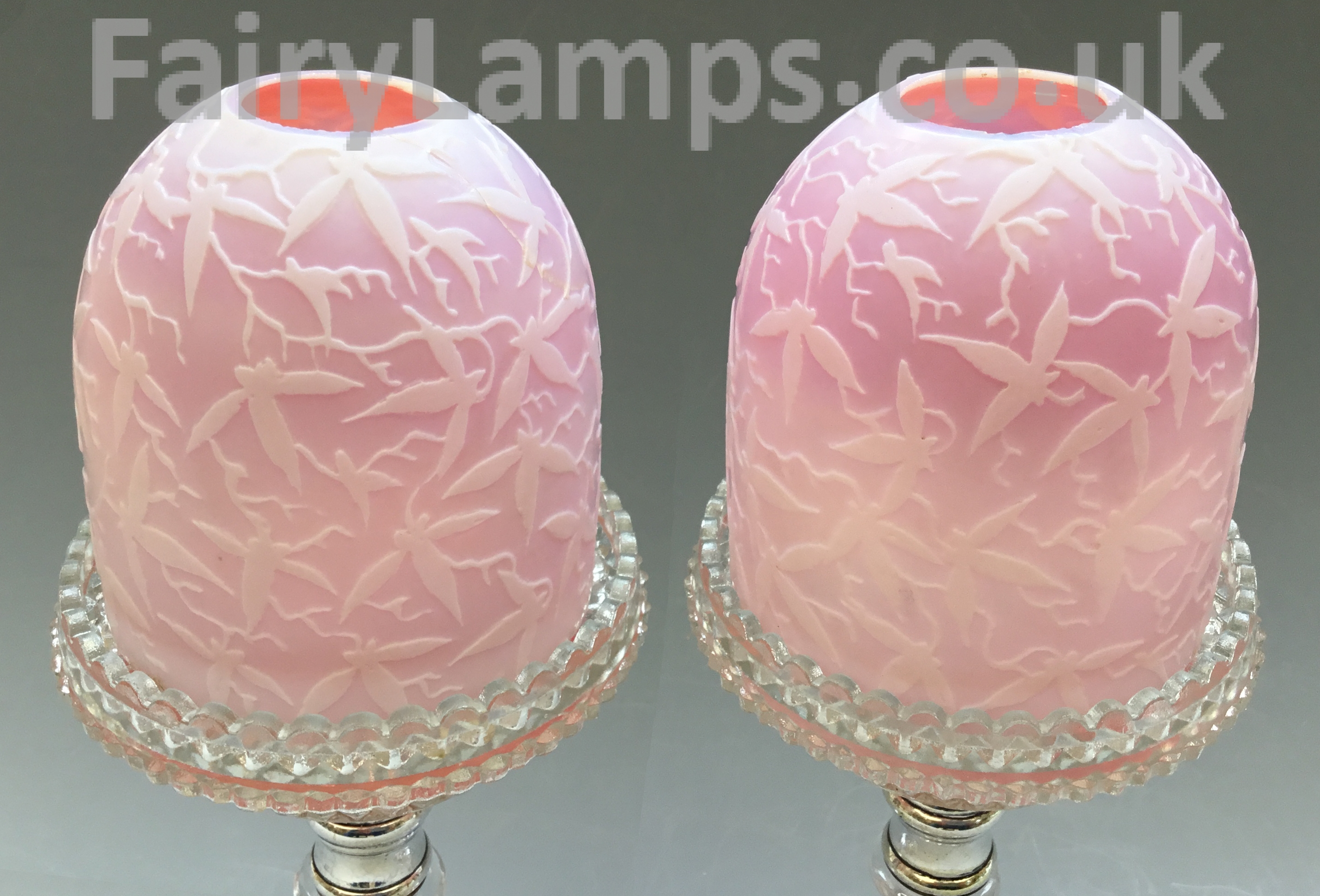 Lot 1399 English deep acid cut back FLORAL VINING AND CUT GLASS PEDESTAL FAIRY LAMPS, PAIR, cased pale rose/pink to opal, fairy-size domes with overall delicate floral vining pattern, multi-part construction comprising the dome fitted on a colorless Clarke’s pressed glass with diamond-point pattern candle lamp base embossed “S. CLARKE PATENT TRADE MARK CRICKLITE”, candle lamp base with brass connector and supported by a standard with baluster-form cut stem, plain panels and horizontal lines, and a cut-glass circular-form foot with large cut hobstar, one foot with acid stamp “MADE IN ENGLAND”. Possibly Thomas Webb & Son. From the Grahams Collection USA