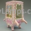 Fairy sized decorated Lithophane dome (3 pictures) with pink trim, on a white and pink porcelain base. Scenes depict an angel holding a child outside a window, angel appearing to a woman in prayer and an angel descending with child and flowers in her arms. Dome is marked with a sickle.