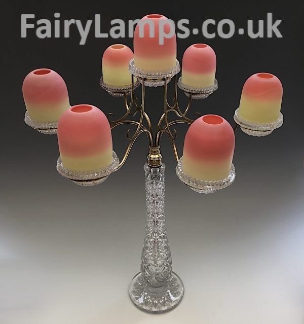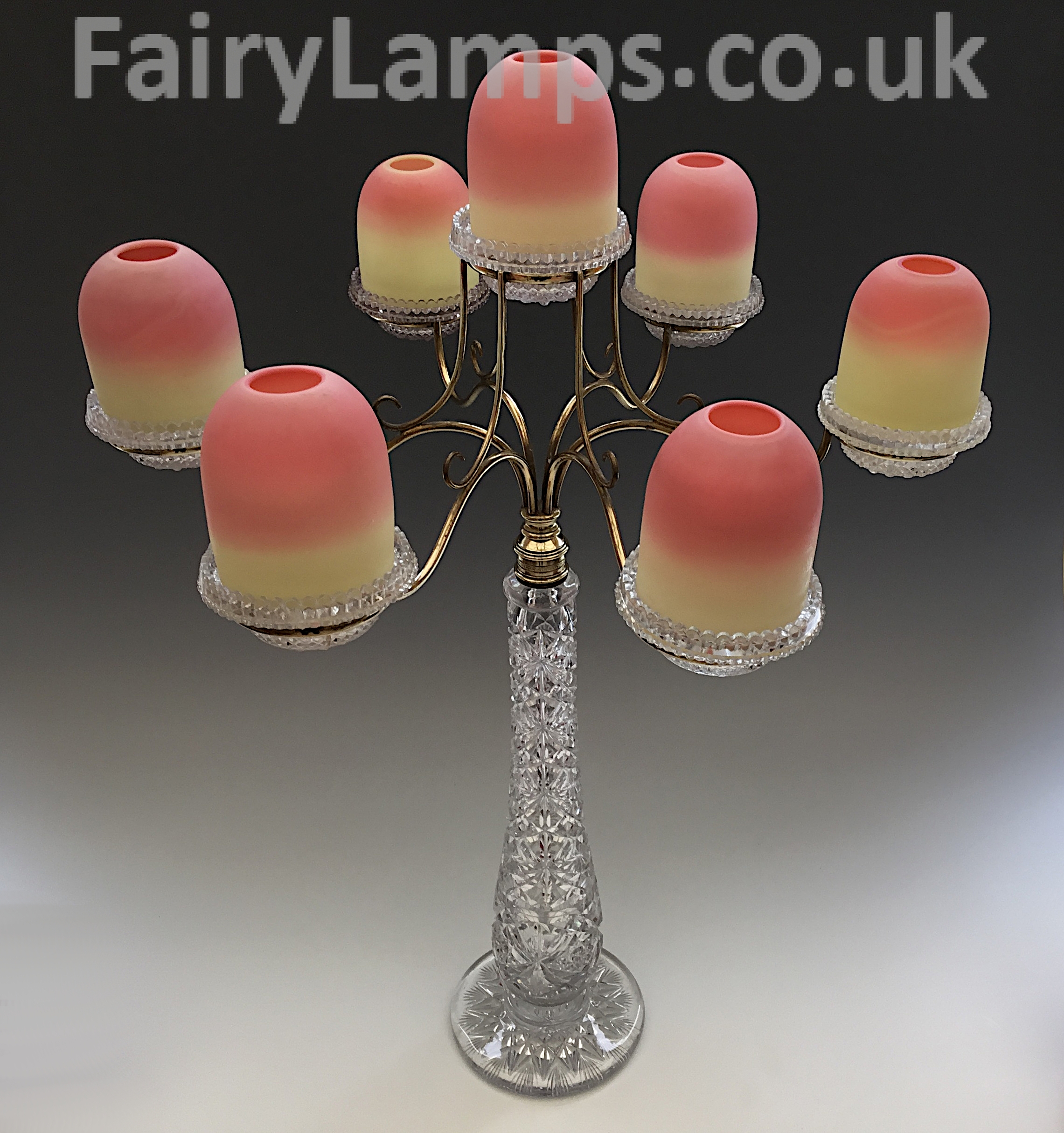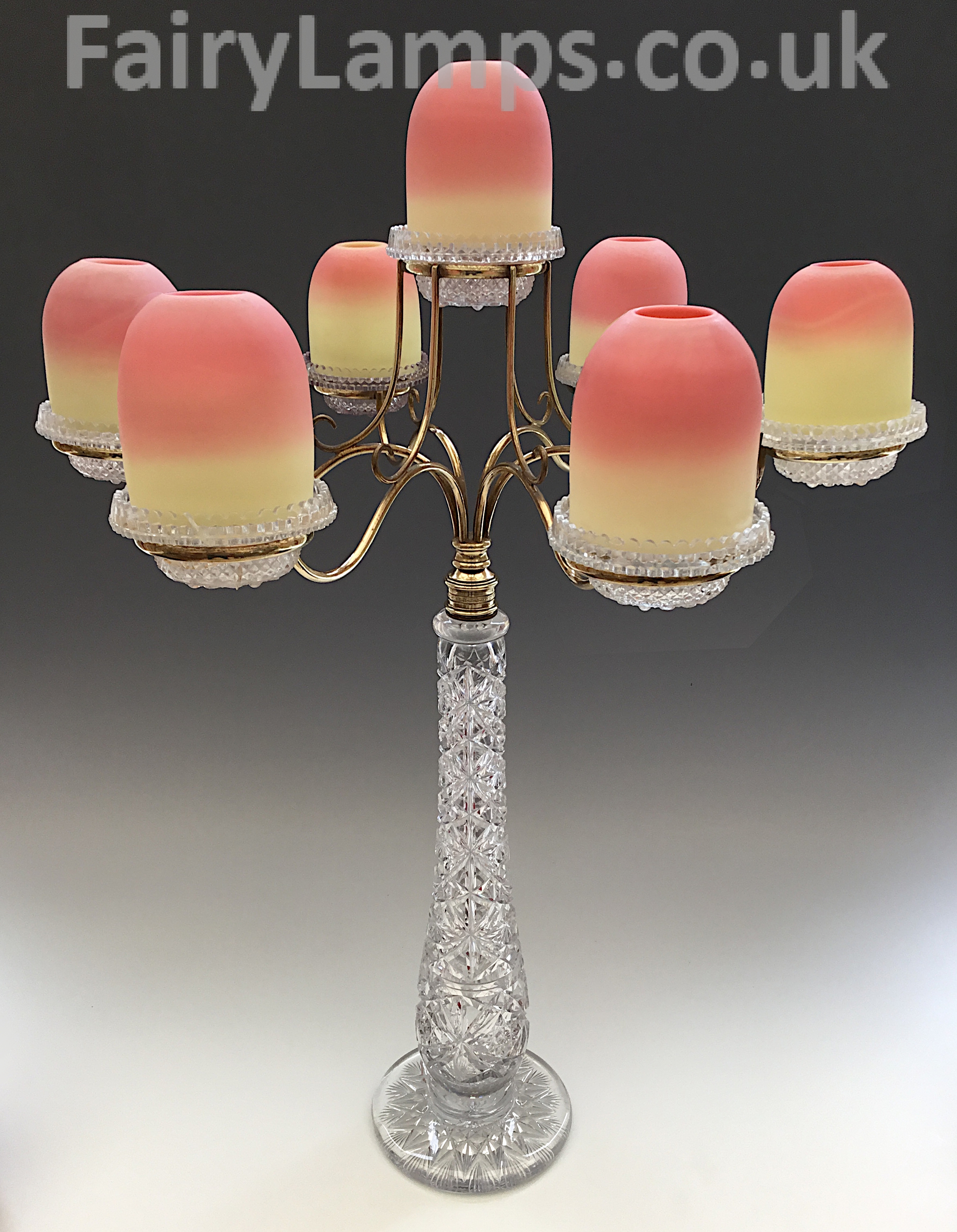 Clarkes Patent Trademark Cricklite candelabra by Samuel Clarke of Cricklewood, London, the clear cut crystal glass base by Thomas Webb & Sons with a circular spread foot below a tapered hollow blown column, heavily cut with mitre cut diamonds and pin wheel stars, below an open work brass 7 branch gallery, fitted with Clarkes Patent Cricklite bases and Queens Burmese domes, height 75cm.