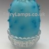 Pyramid sized white house sitting on a green lamp cup in the shape of a hill with steps running up one side. Base is impressed “S.Clarke Fairy Pyramid” depression for candle and ribbing to support dome.